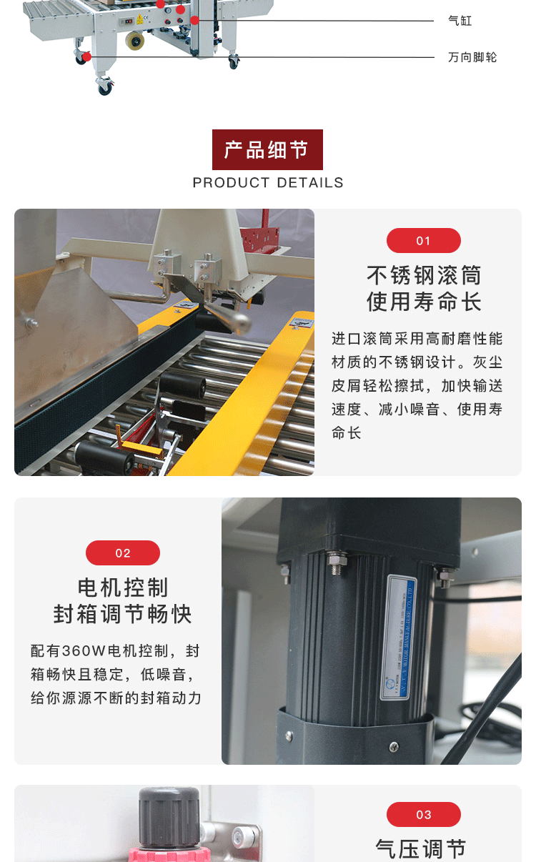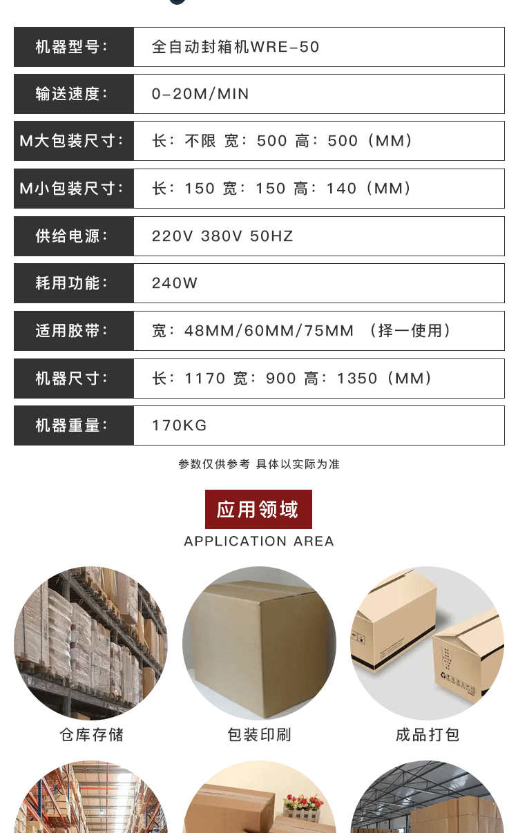 介紹:全自動(dòng)封箱機(jī)WRE-50可以自動(dòng)調(diào)節(jié)紙箱高度及寬度,更換不同規(guī)格紙箱無需人工調(diào)節(jié);推薦更換紙箱規(guī)格頻繁的用戶使用。 該款封箱機(jī)廣泛應(yīng)用于食品、醫(yī)藥、玩具、煙草、日化、電子等行業(yè)。 產(chǎn)品別稱:全自動(dòng)封箱機(jī)、工字封箱機(jī)、一字封箱機(jī)、十字封箱機(jī)、四角邊封箱機(jī)、上下驅(qū)動(dòng)封箱機(jī)、左右驅(qū)動(dòng)封箱機(jī)、快遞封箱機(jī)、電商封箱機(jī)、膠帶封箱機(jī)、快速封箱機(jī)、可調(diào)封箱機(jī)、伺服封箱機(jī)